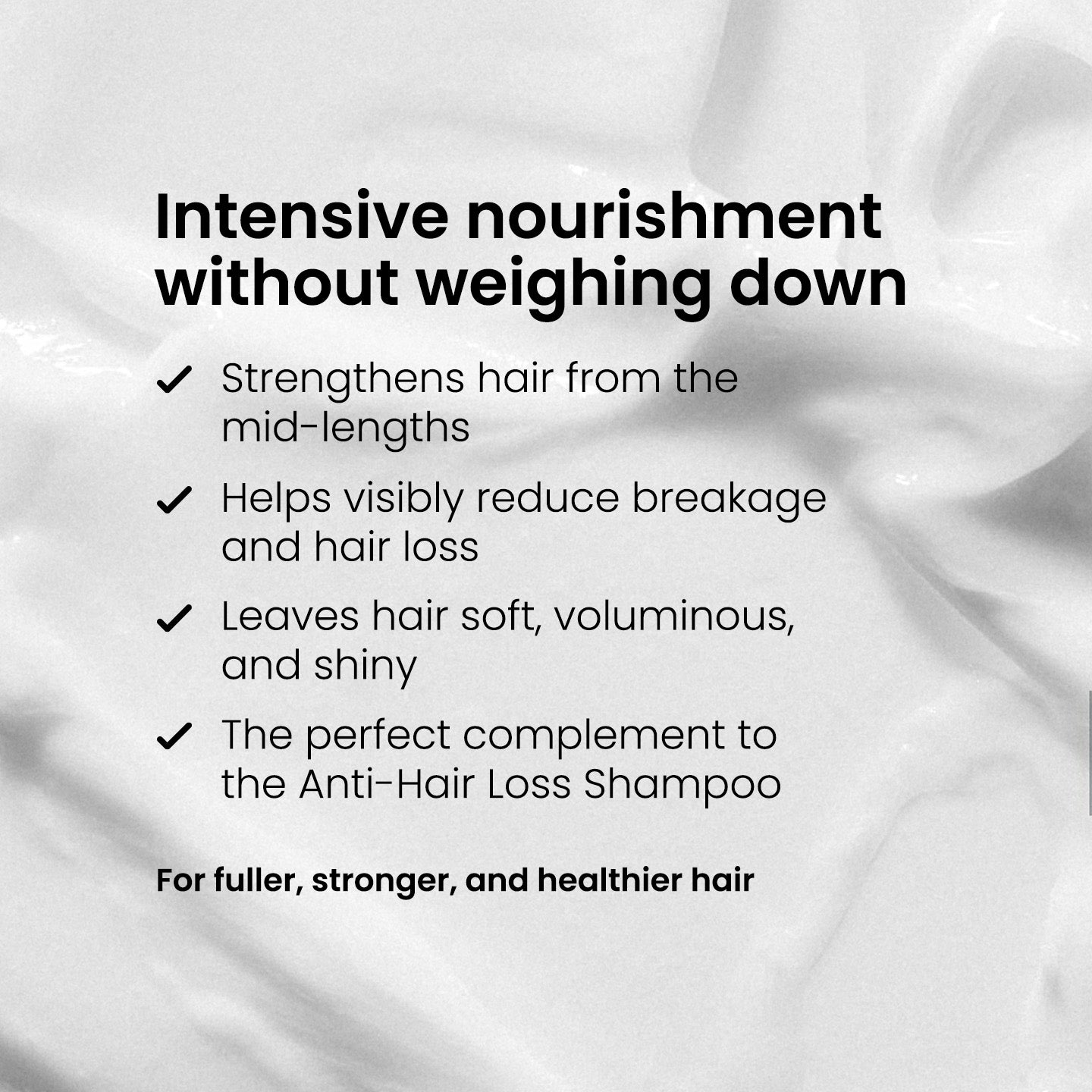 The Anti-Hair Loss Conditioner contains active ingredients that nourish and strengthen the hair. It prevents hair loss and stimulates hair growth. The conditioner also slows down the natural wear of the hair and prevents dehydration. It restores the moisture balance in the hair.