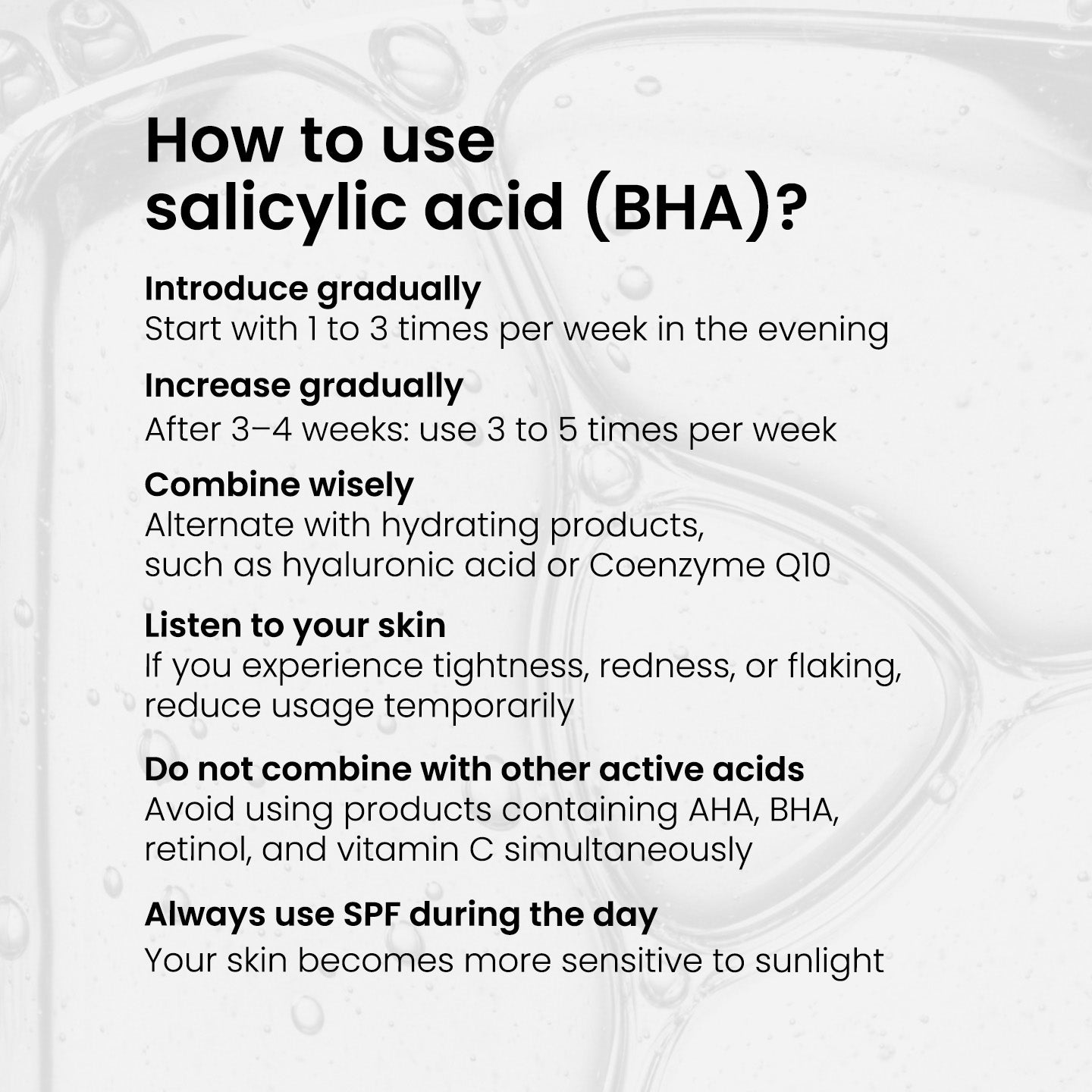When following a BHA routine, it’s important to combine products carefully to avoid skin irritation. Start slowly, use BHA only in the evening, and pay close attention to how your skin reactsespecially if you're new to acids.