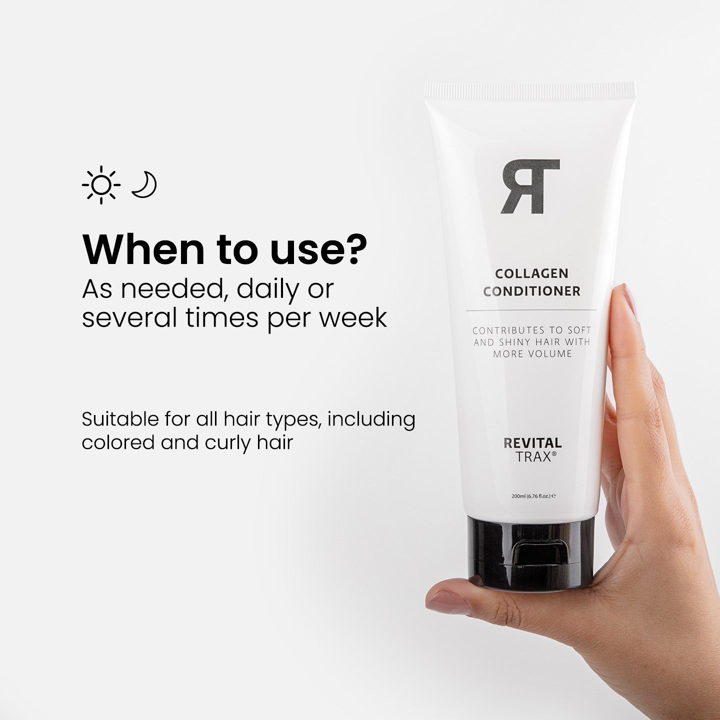 First use the Collagen Volume Shampoo. Then take the right amount of conditioner in the palm of your hand and apply it to (the middle or the ends of) your hair. Let it soak for 2 to 3 minutes. Rinse the conditioner well.