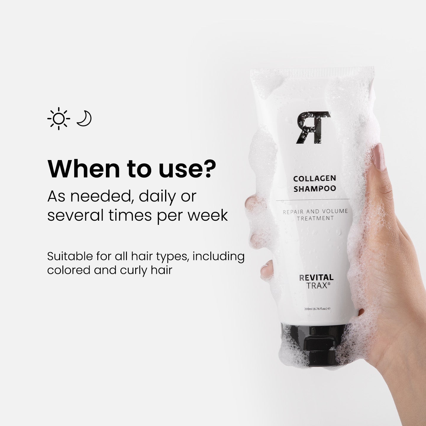 Wet your hair first. Then take the right amount of shampoo in the palm of your hand and wash your scalp and hair with it. For best effect, wash time is 3 to 5 minutes. Rinse the shampoo well and then use the Collagen Volume Conditioner to close your hair cuticles.