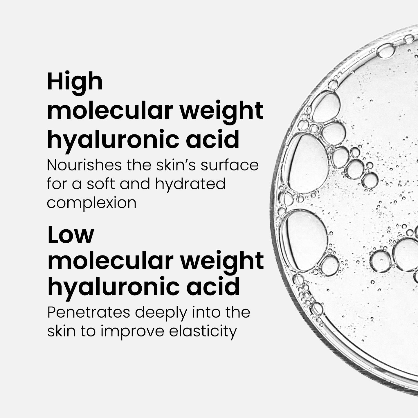 Our products with hyaluronic acid use high and low molecular hyaluronic acid. High molecular hyaluronic acid hydrates the outer layers of the skin and causes it to saturate with moisture. This is very useful and certainly necessary, but hydration of the inner layers of the skin gives even more effect. The low molecular hyaluronic acid consists of smaller molecules, which can penetrate deeper into the skin and provide the inner layers of the skin with an ultimate moisture boost.