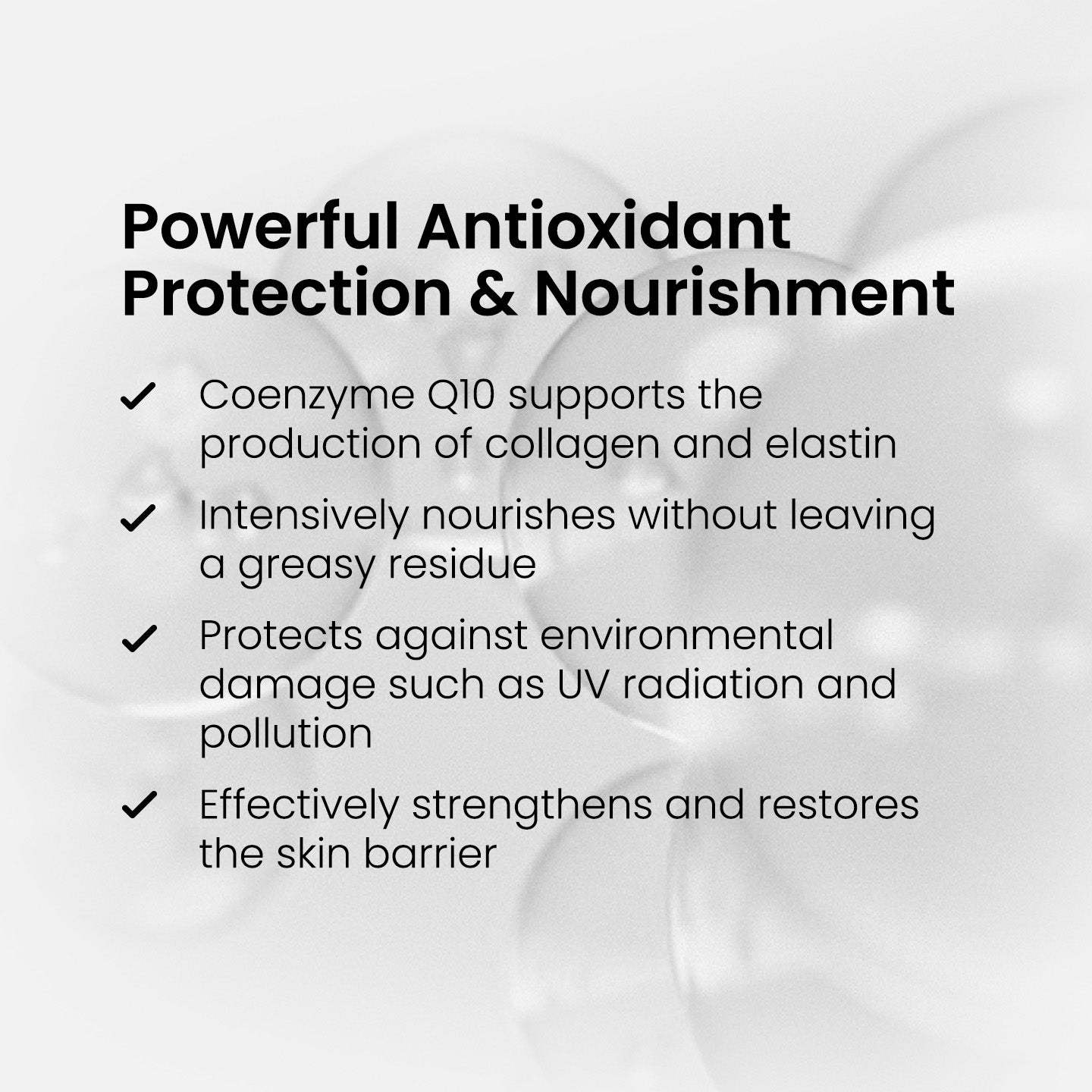 Impulsado por la coenzima Q10, reduce visiblemente las líneas finas y fortalece la defensa de tu piel contra los factores ambientales. Repleto de antioxidantes y vitaminas, la fórmula apoya la barrera cutánea y potencia el proceso natural de reparación de la piel.