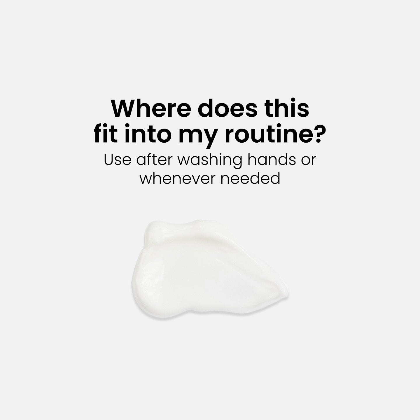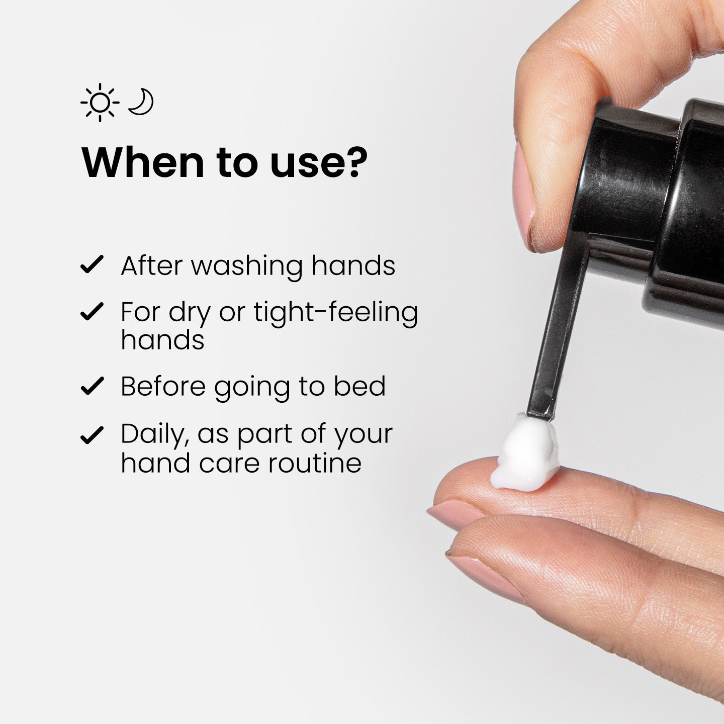 Aplica la crema de manos sobre la piel limpia y seca. Extiende de manera uniforme y masajea suavemente. Adecuado para uso diario.