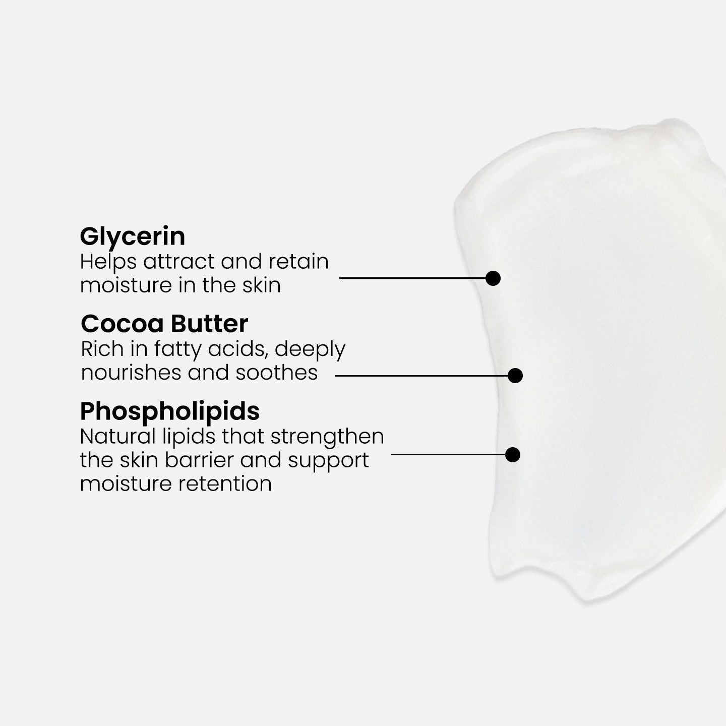 Aqua, Glycerin, Caprylic/capric Triglyceride, Theobroma Cacao Seed Butter, Phospholipids, Cetearyl Alcohol, C14-22 Alcohols, C12-20 Alkyl Glucoside, C15-19 Alkane, Tocopherol, Citrus Reticulata (Tangerine) Peel Extract, Carbomer, Tromethamine, Parfum, Phenoxyethanol, Ethylhexylglycerin.