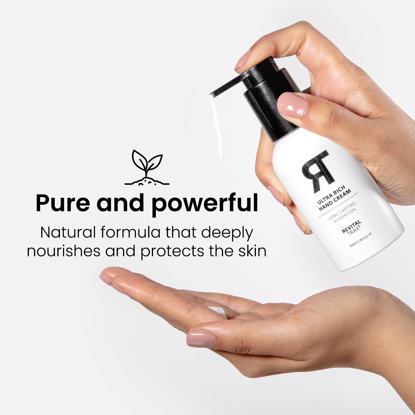 Experience the ultimate luxury in hand care with the RevitalTrax Ultra Rich Hand Cream. This gentle formula is enriched with a harmonious blend of natural ingredients for deep and long-lasting hydration, leaving skin feeling silky smooth and looking younger.