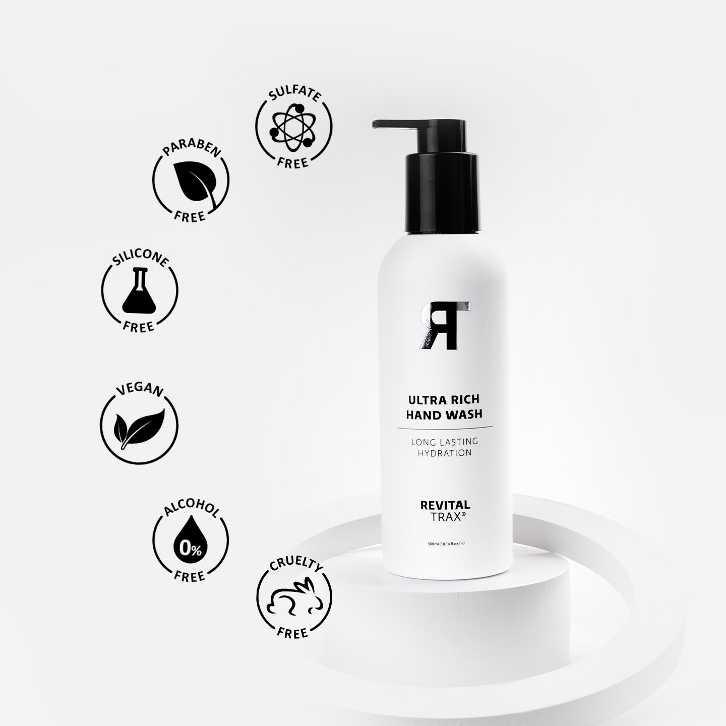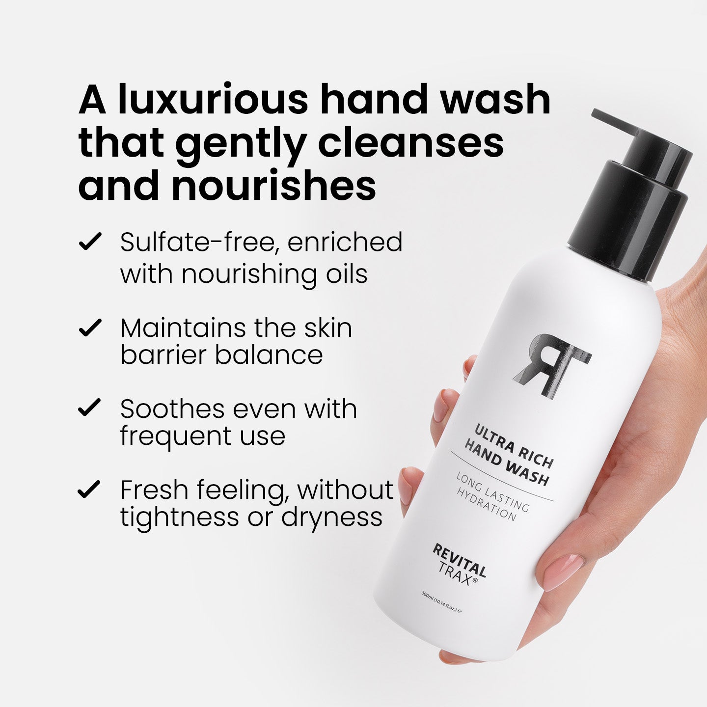 Discover the RevitalTrax Ultra Rich Hand Wash, designed to not only cleanse but also pamper your hands. This advanced formula combines the purity of natural ingredients with in-depth knowledge of skin care. Feel how your hands feel refreshed and silky smooth after each use, while the rich ingredients soothe and intensively condition. Protect your skin from dehydration and maintain hydration for healthy, radiant hands. Be seduced by the delightful fragrance that enchants your senses and make hand washing a pleasurable experience.