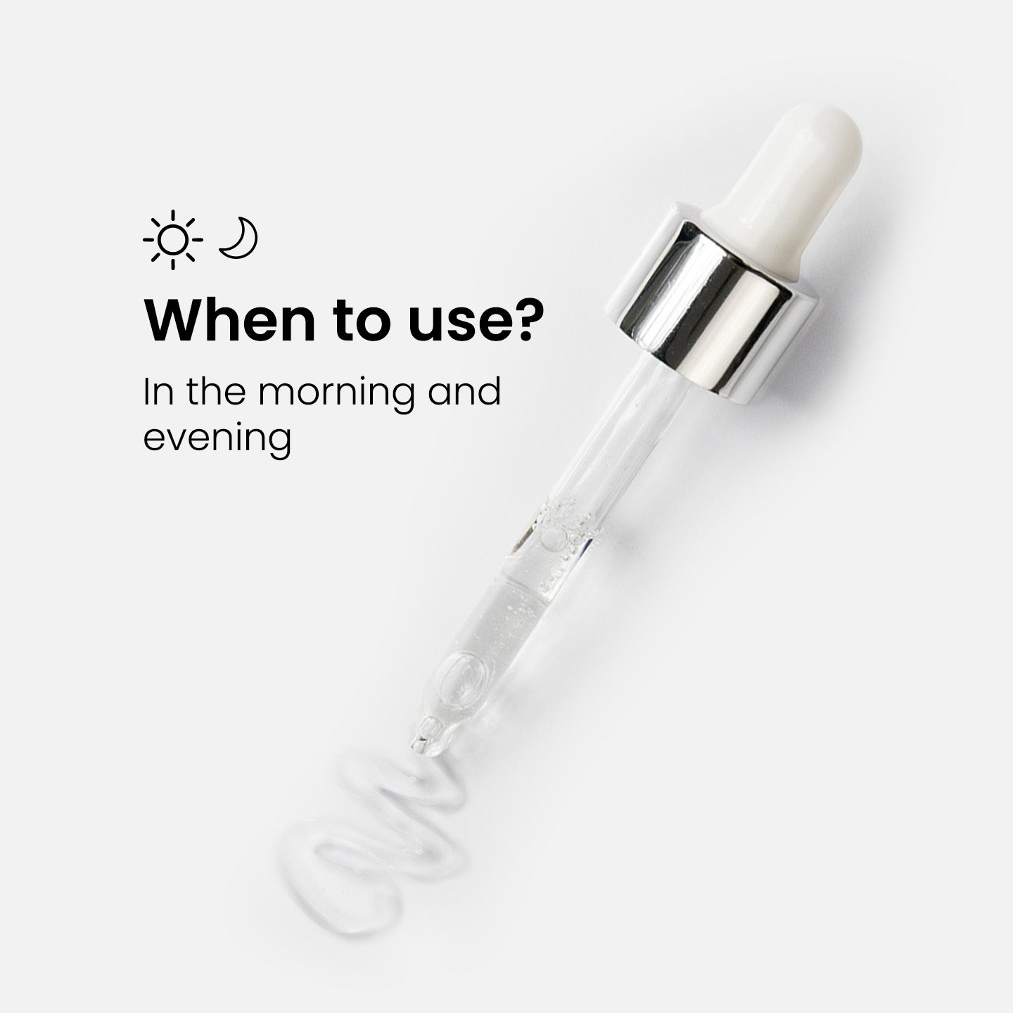 In de avond adviseren wij om 3 tot 5 druppels van het Hyaluronic Serum aan te brengen op uw gezicht, nek en decolleté voor het hydrateren van de huid en het aanvullen van hyaluronzuur.